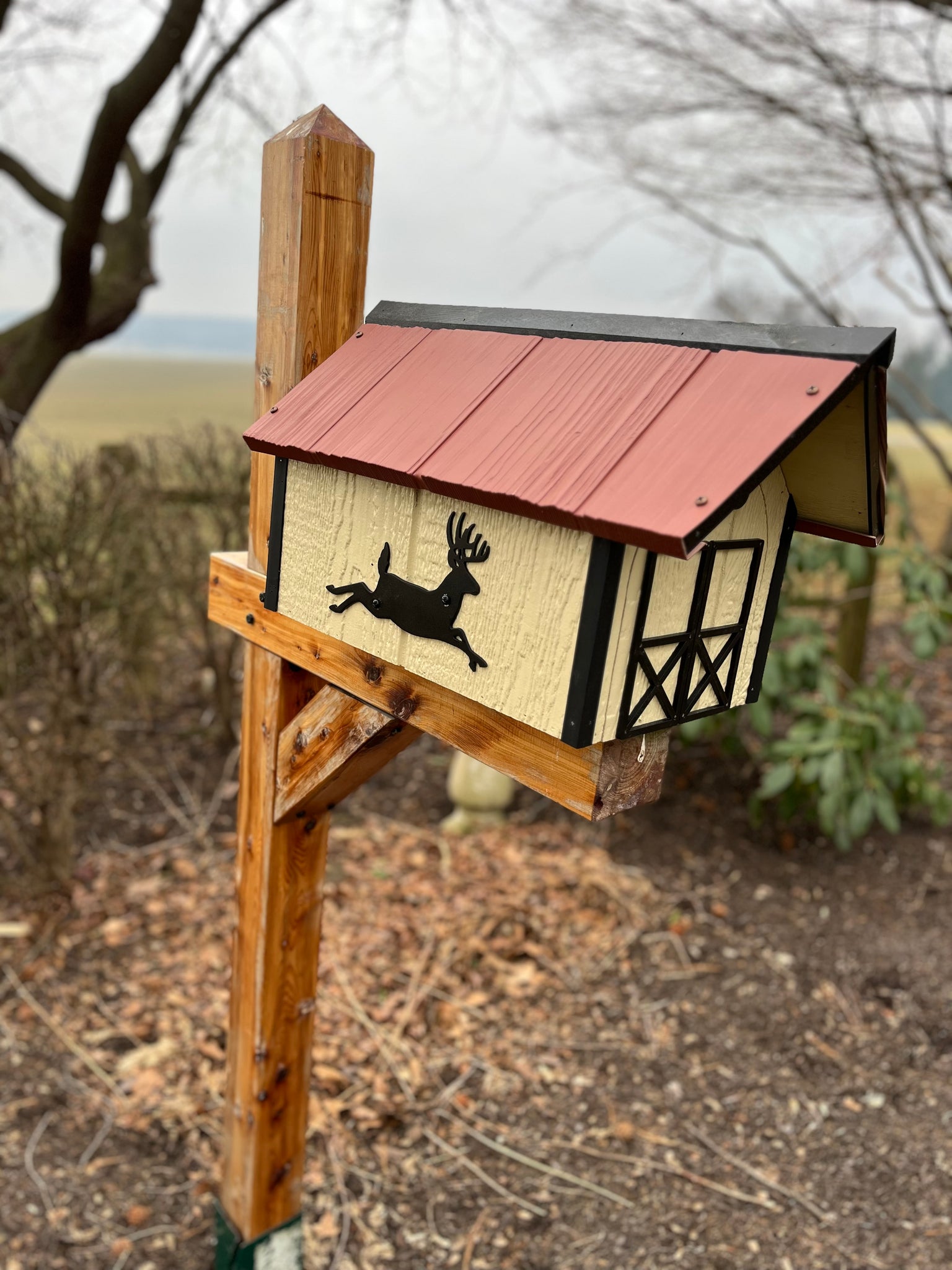 Simple mailbox design with a durable vinyl roof and a metal dog silhouette. Where your love of your dog on your mailbox!